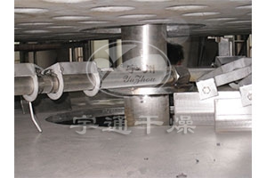 含有溶劑的濕物料通過(guò)螺旋加料器連續加入主機加料斗,物料在攪拌電機作用下連續地加到干燥器上部第一層干燥盤(pán)上,帶有耙葉的耙臂做回轉運動(dòng)使耙葉連續的翻抄物料,使物料充分吸收熱量,物料沿指數螺旋線(xiàn)流過(guò)干燥盤(pán)表面,在小干燥盤(pán)上的物料被移送到外緣,并在外緣落到下方的大干燥盤(pán)的外緣,在大干燥盤(pán)上的物料向里移動(dòng)并從中間落料口落入下層小干燥盤(pán)中,大小干燥盤(pán)上下交替排列,物料得以連續的流過(guò)整個(gè)干燥器,中空的干燥盤(pán)內通入加熱介質(zhì)導熱油。加熱介質(zhì)由干燥盤(pán)的一端進(jìn)入干燥盤(pán)面,從另一端導出。已干燥的物料從最后一層干燥盤(pán)落到殼體的帶冷卻底層,最后被耙葉移送到出料口排出進(jìn)入底部出料螺旋,并經(jīng)緩沖罐排出機外。濕份溶劑從物料中蒸發(fā)汽化后逸出,由設在頂部的緩沖罐沉降后抽出,溶劑經(jīng)冷凝器冷凝進(jìn)入緩沖罐回收,濕空氣最后排空。